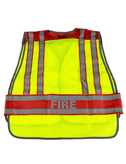 Our all new Lime & Red high-visibility public safety vest has high-viz lime knit and mesh with contrasting red shoulders and velcro waist closure. Pre-labeled with the words FIRE in three locations (two vertical on front and one horizontal on the back) no one will fail to notice the wearer of this vest is a firefighter. Adjustable for seasonal attire, rainwear and turn-out gear, this vest is available in two adjustable sizes; M to XL and 2XL to 4XL. 4-point break-away design ensures outerwear will tear from the wearer if grabbed or caught on a moving vehicle.