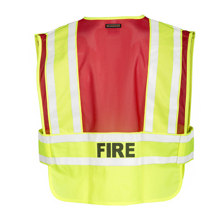 High-visibility public safety vest with opposing red mesh is prelabeled FIRE in block lettering. Adjusts to fit individual sizes, coats and uniforms. If caught on a moving vehicle or machine, the 5-point break-away design allows vest to tear from the wearer.