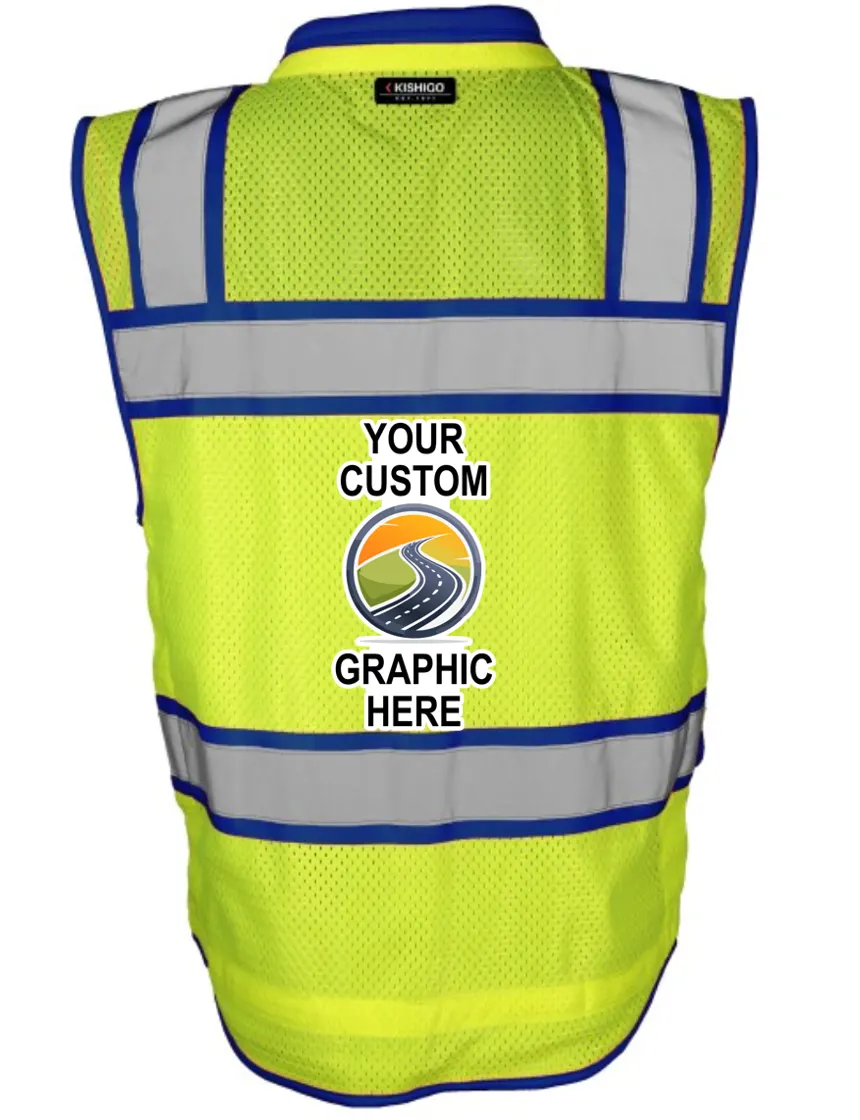 Kishigo Color Contrast High Performance Surveyors Lime & Blue, Class 2 Safety Vest, 5XL with Full Color Graphic