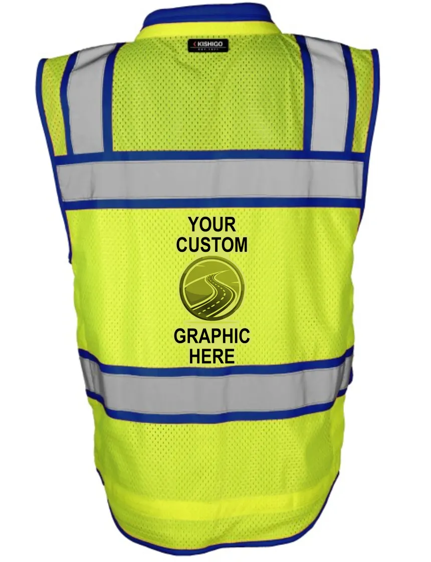 Kishigo Color Contrast High Performance Surveyors Lime & Blue, Class 2 Safety Vest, Medium with Single Color Graphic